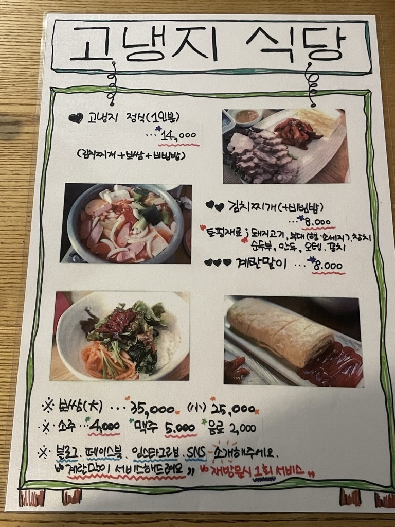 고냉지의 메뉴판.