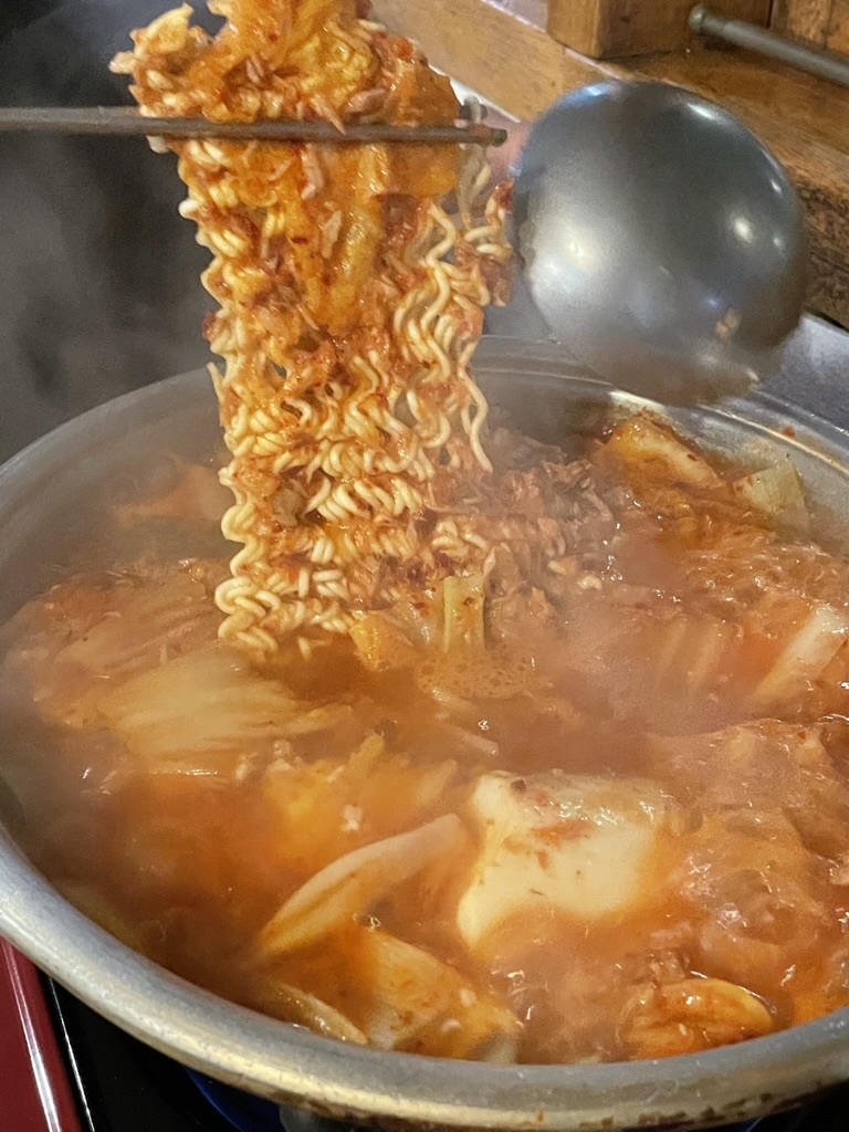 김치찌개가 끓어오르면 라면사리를 투하한다.